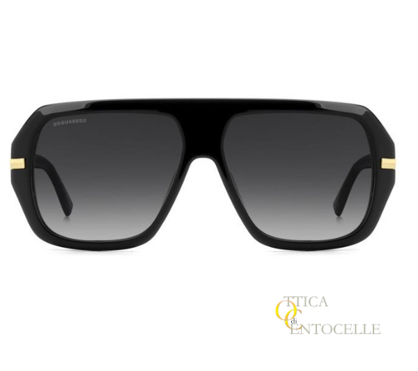 Occhiale da sole da uomo Dsquared2 mod. D20156/S. Meravigliosa maschera di grandi dimensione, color nero lucido. Bellissimi i fregi color oro sulle aste. Completano il quadro le lenti color fumo sfumate.