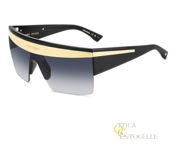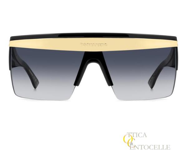 Occhiale da sole da uomo Dsquared2 mod. D20188/S. Grande maschera con montatura nera lucida e fregi color oro sia nella zona anteriore che sulle aste. A completare il quadro, le magnifiche lenti azzurro sfumato.