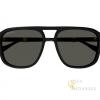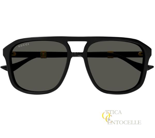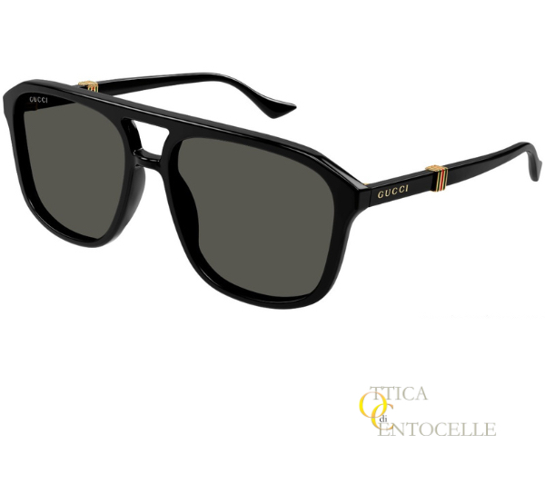 Occhiale da sole da uomo Gucci mod. GG1494S. Montatura con doppio ponte, quadrata di colore nero lucido, elegante e raffinata per distinguersi in ogni occasione. Logo Gucci sulle aste, dove figura anche un fregio con i colori tipici del brand. Lenti color verde scuro.